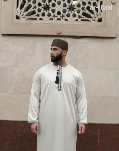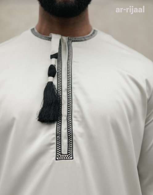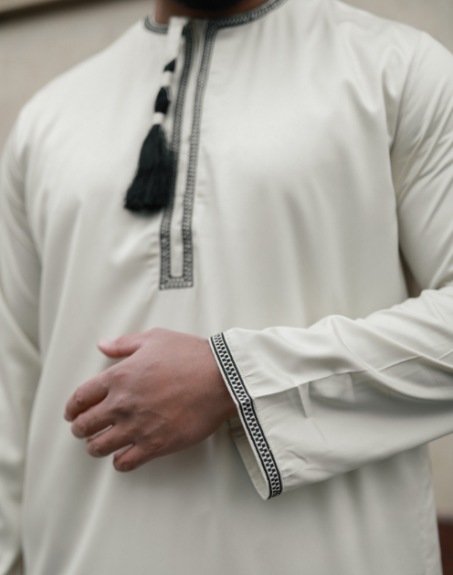 Ivory Emirati Thobe tassle , details in chest and hand