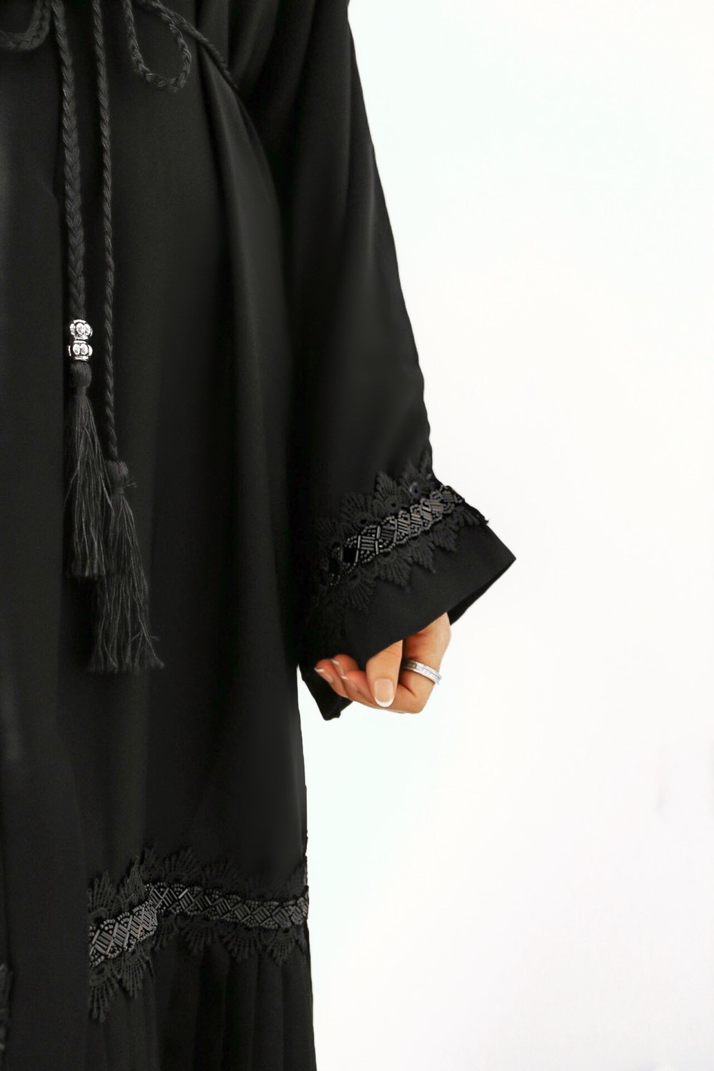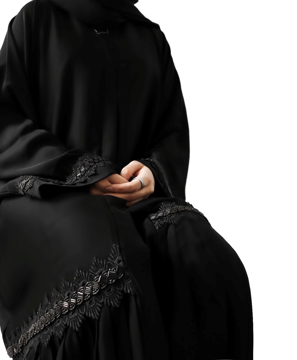Colours: Black Abaya with Black Diamante designs and a Pleated bottom.
